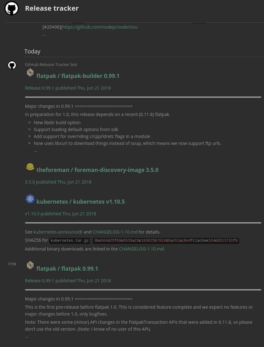 Decided to actually start pushing code I've been slowly prodding at for the last while, ever since starting the Ruby Matrix SDK in fact. Working on a Sibbell like system that tracks new releases on GitHub projects, posting them into a specified Matrix room.